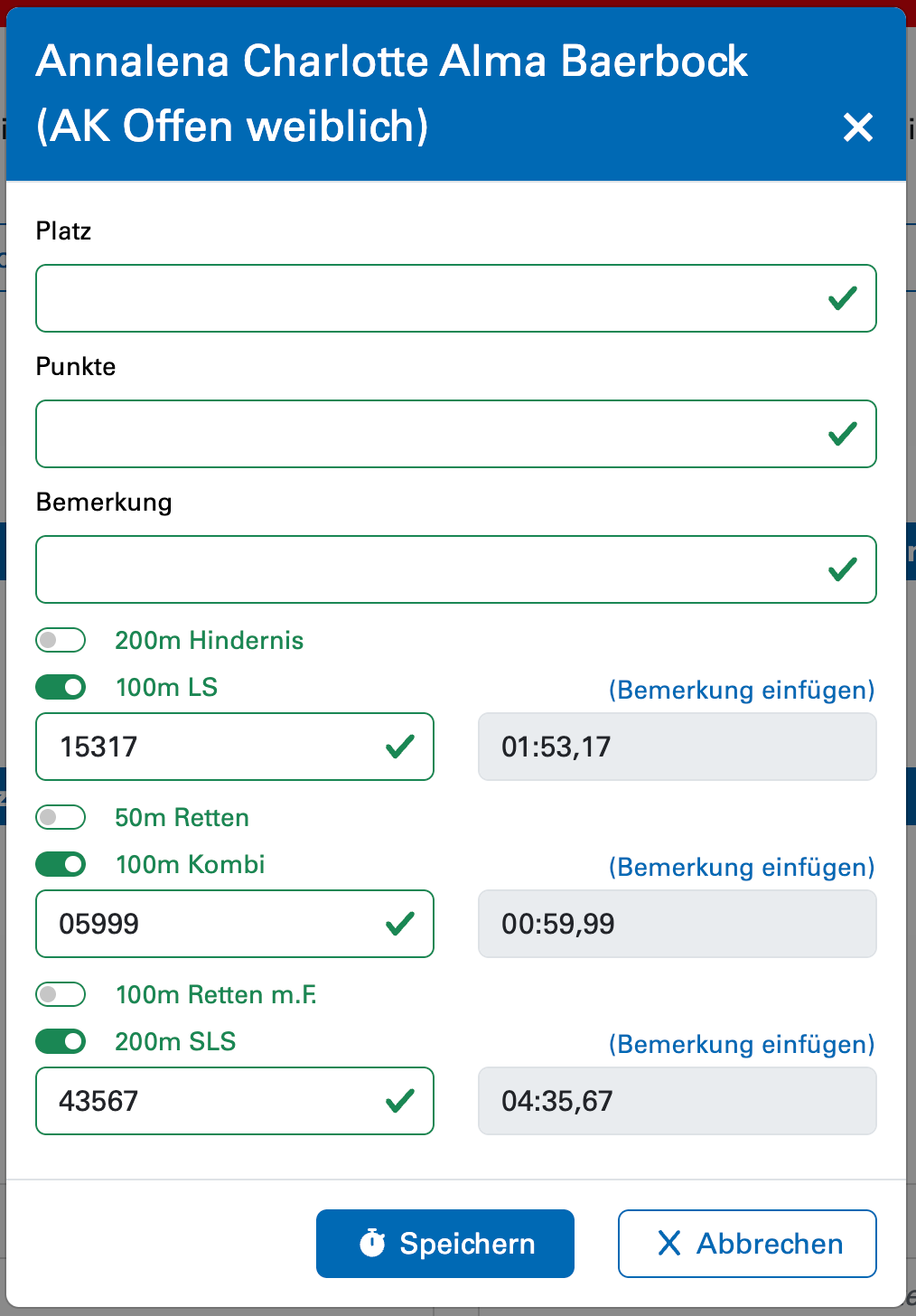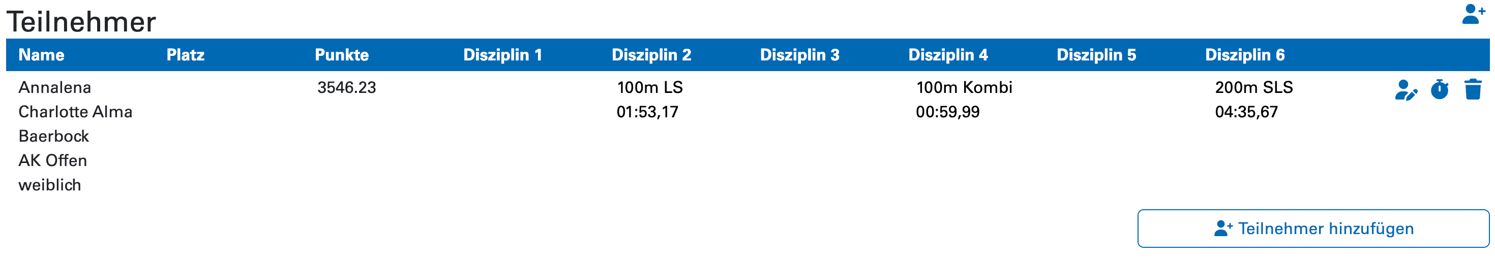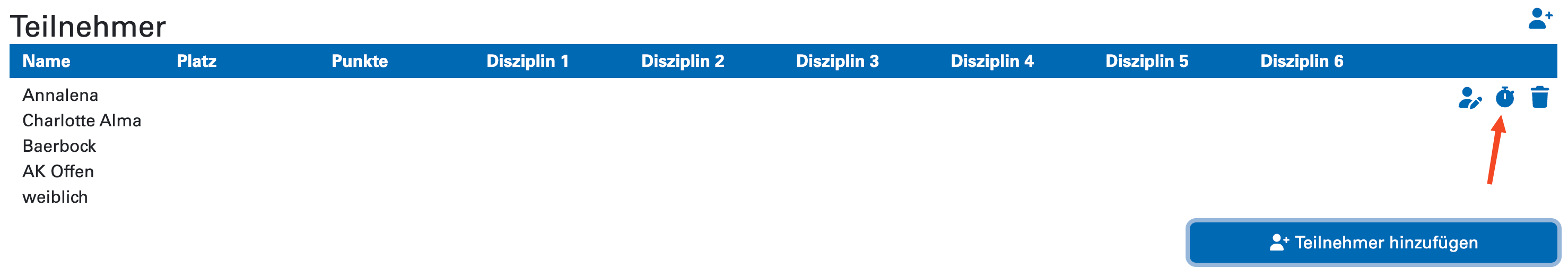 Nach dem Speichern kann mit dem Klick auf das Stoppuhr-Symbol ggf. die Disziplinauswahl durchgeführt werden und Meldepunkte eingetragen werden.