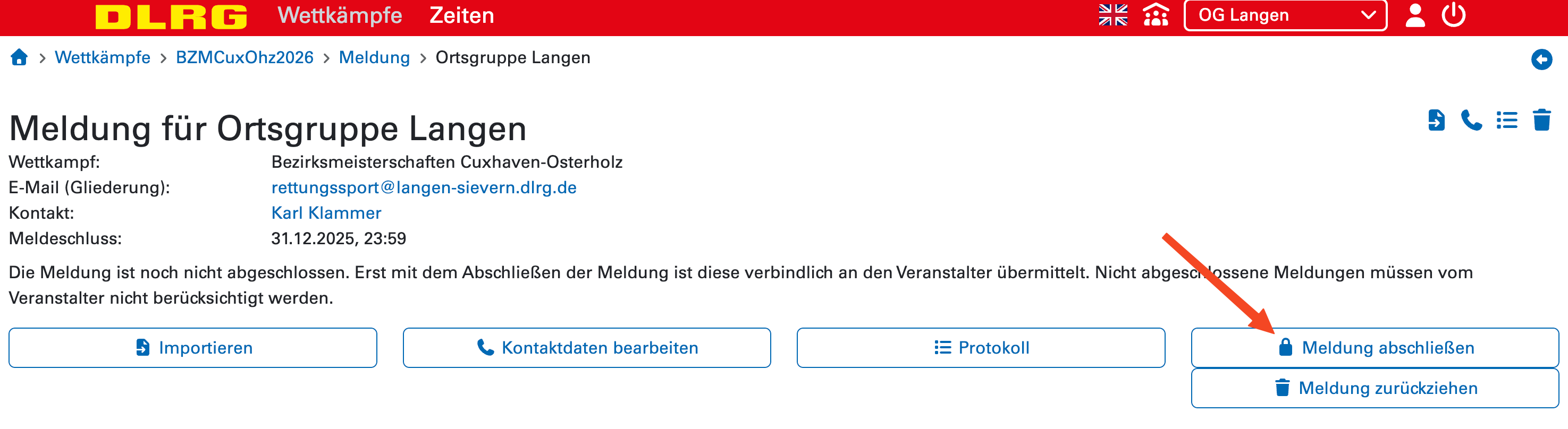 Nach einem weiteren Klick auf Meldung abschließen ist die Meldung abgegeben und wird für den Wettkampf berücksichtigt.
