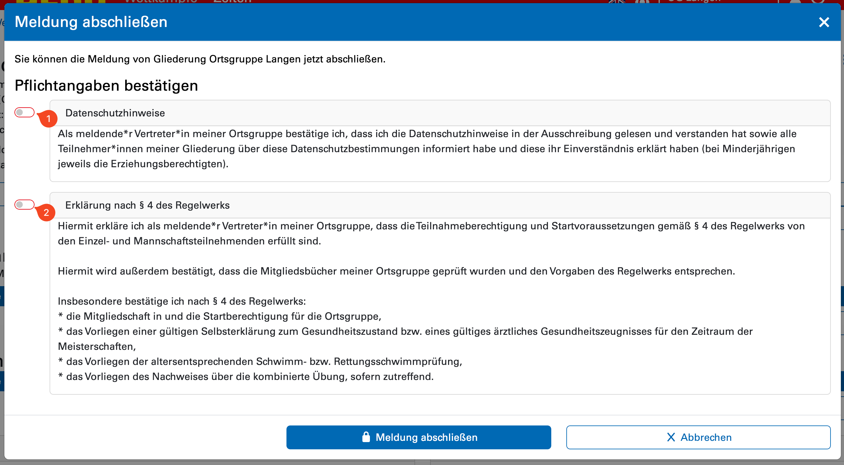 Falls keine Probleme bestehen, öffnet sich ein Dialog, in dem die Pflichtangaben, in unserem Fall die Datenschutzerklärung (1) sowie die Erklärung nach § 4 des Regelwerks (2) bestätigt werden müssen.