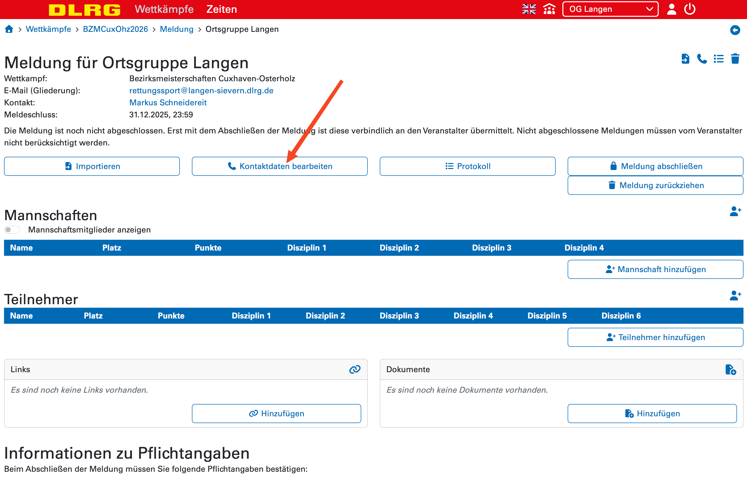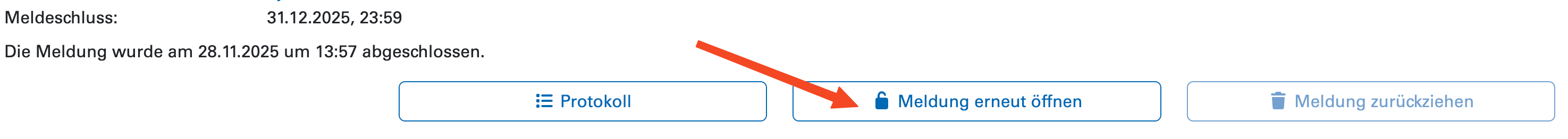 Bis zum Meldeschluss kann die Meldung jederzeit mit Klick auf Meldung erneut öffnen zum Bearbeiten wieder geöffnet werden.