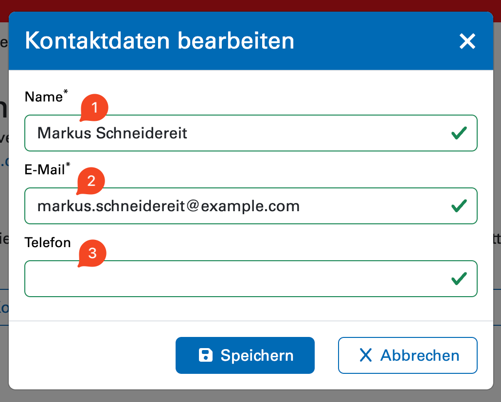 Dort können Name (1), E-Mail-Adresse (2) sowie Telefonnummer (3) angegeben werden. An diese Adresse werden Informationen über veröffentlichte Daten gesendet. Dieses Formular ist keine Meldung des*der Delegationsleiter*in. Dies erfolgt, wie im allgemeinen Abschnitt beschrieben, im ISC. Per Klick auf Speichern können die Daten gespeichert werden.