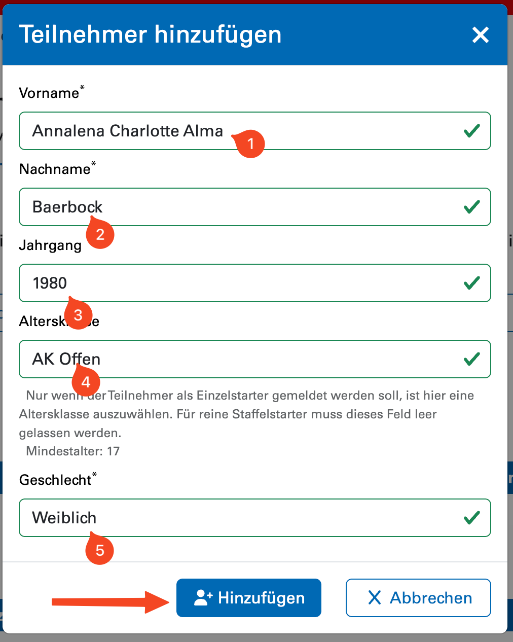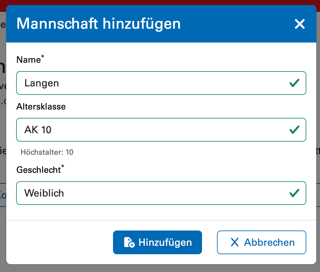 Hier können auch Personen hinzugefügt werden, die reine Mannschaftsmitglieder sind. In diesem Fall darf im Feld Altersklasse (4) keine Altersklasse ausgewählt werden. Falls hier eine ausgewählt wird, wird die Person für den Einzelwettkampf gemeldet.